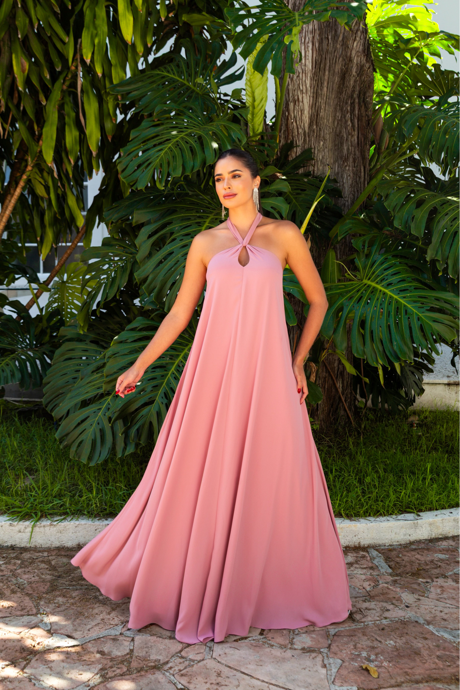 • Por possuir as costas abertas e amarração no pescoço, o uso de cabelos presos (como um coque alto ou rabo de cavalo desconstruído) valoriza os detalhes da peça.